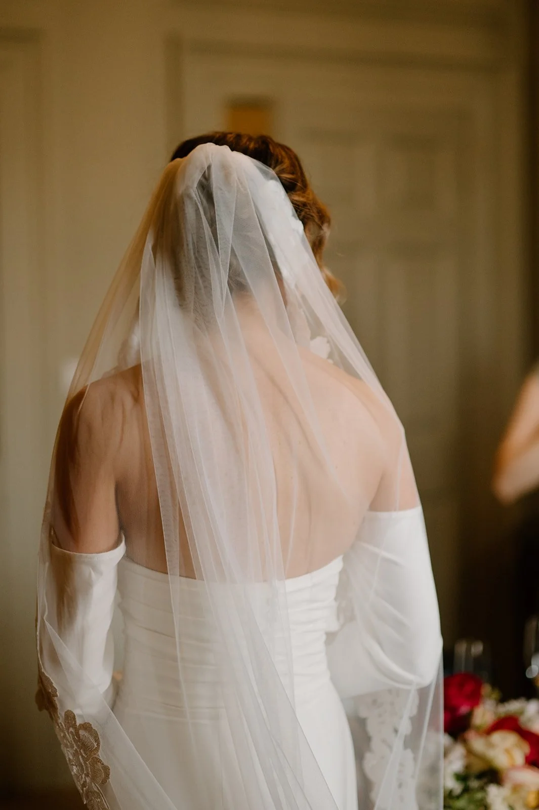We went for naturally enhancing makeup with a touch of soft glam to define her features and ensure her skin looked perfect. Her hair was styled in a low bun with twists and texture, maintaining a soft, romantic feel. Paired with a gorgeous lace-lined veil, Caroline's look was super elegant! She planned to wear her hair loose for the evening reception, so we styled it to ensure the waves would still hold when let down. It worked perfectly, allowing her to enjoy a change of hairstyle for her evening celebration.