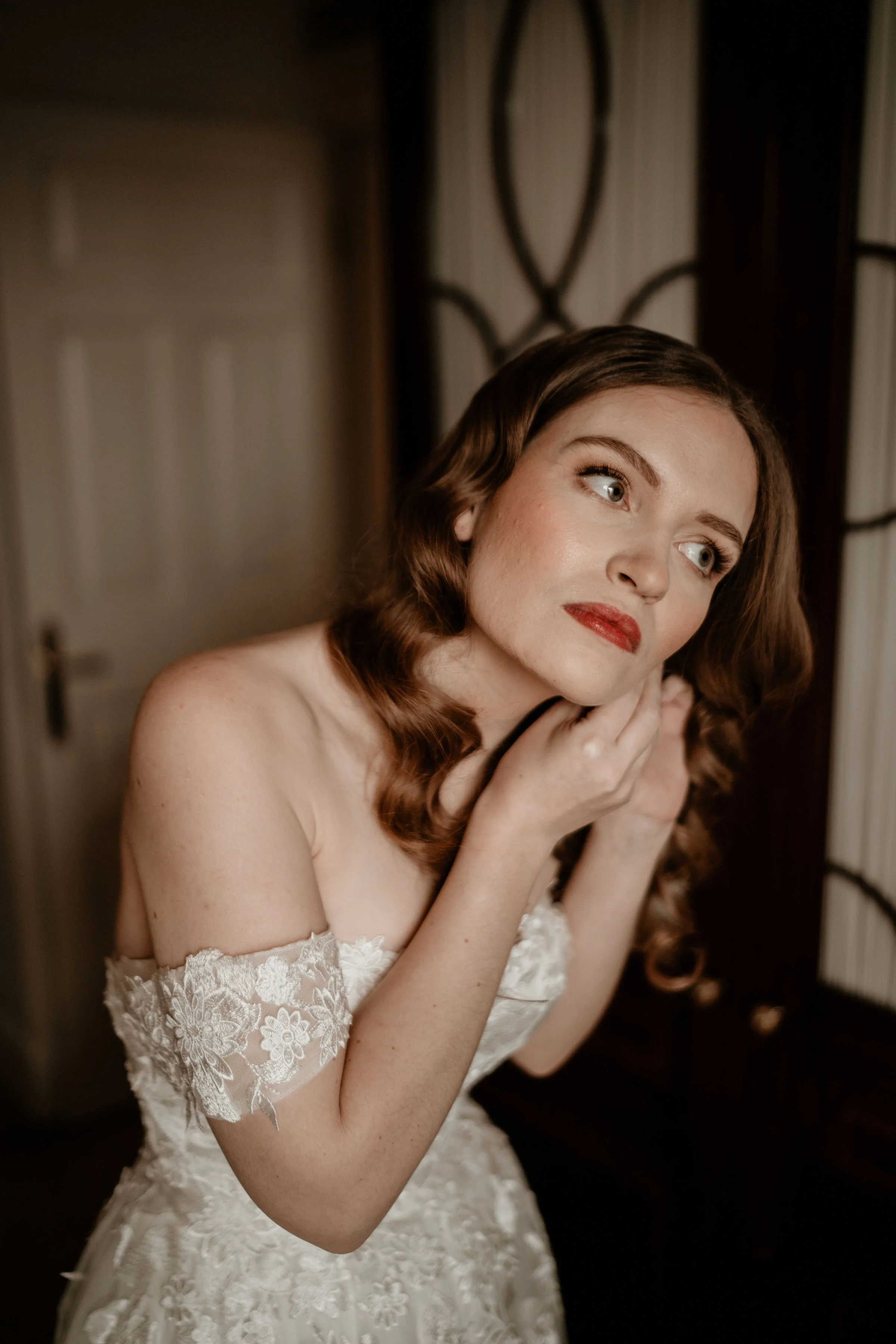 Embracing a flawless blend of modern and vintage, we created a classic hairstyle with a contemporary twist, featuring elegant smooth waves. The bride opted for a sophisticated bridal makeup look that complemented her radiant complexion and enhanced her natural beauty. Adding a captivating pop of red on the lips and a delicate rosy hue to the cheeks gave the makeup a fresh and bright touch; the perfectly timeless bridal look!