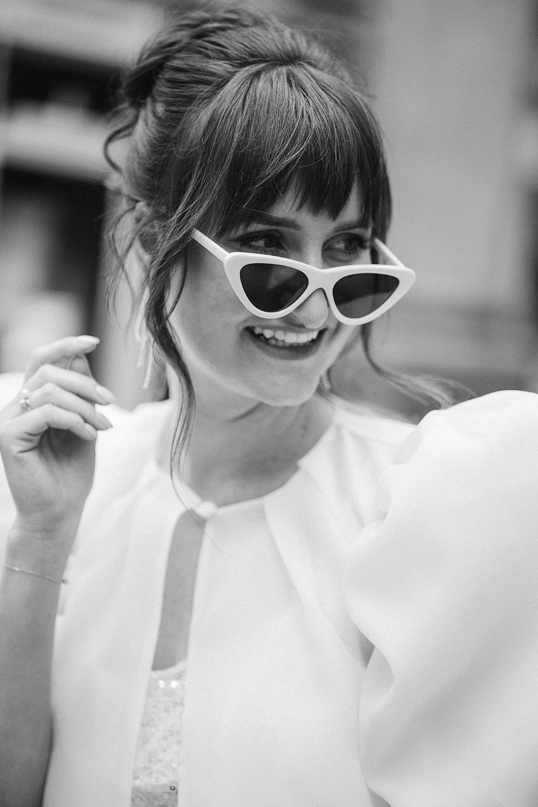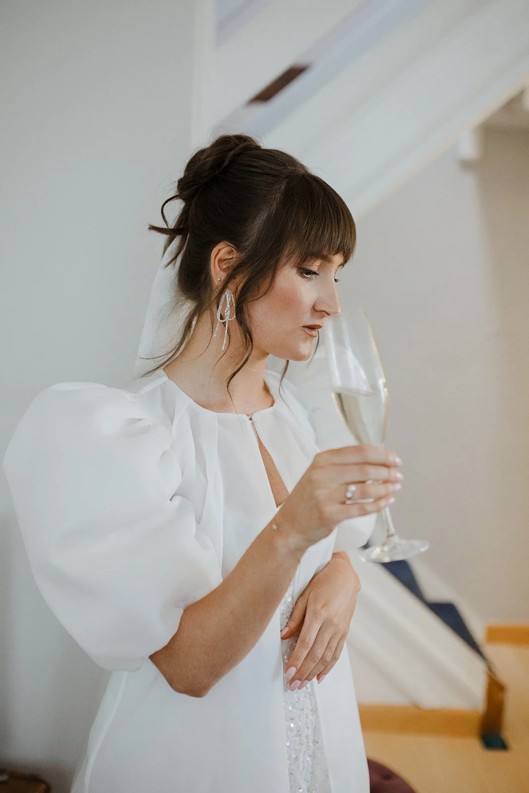 Her hair was styled in a high textured bun, giving an effortless and relaxed feel. This choice was perfect for the easy-going, stylish atmosphere of her London wedding. Instead of a traditional veil, we added a modern twist by using a silk ribbon tied into her hair. The ribbon hung loosely down her back, hinting at a veil while maintaining a contemporary edge.
